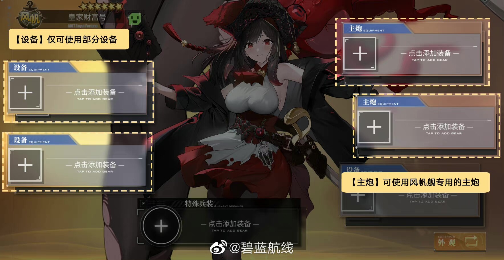 ※帆船の装備バーは図の通りで、[主砲]は帆船専用の主砲、[装備]は一部の装備しか使用できません。