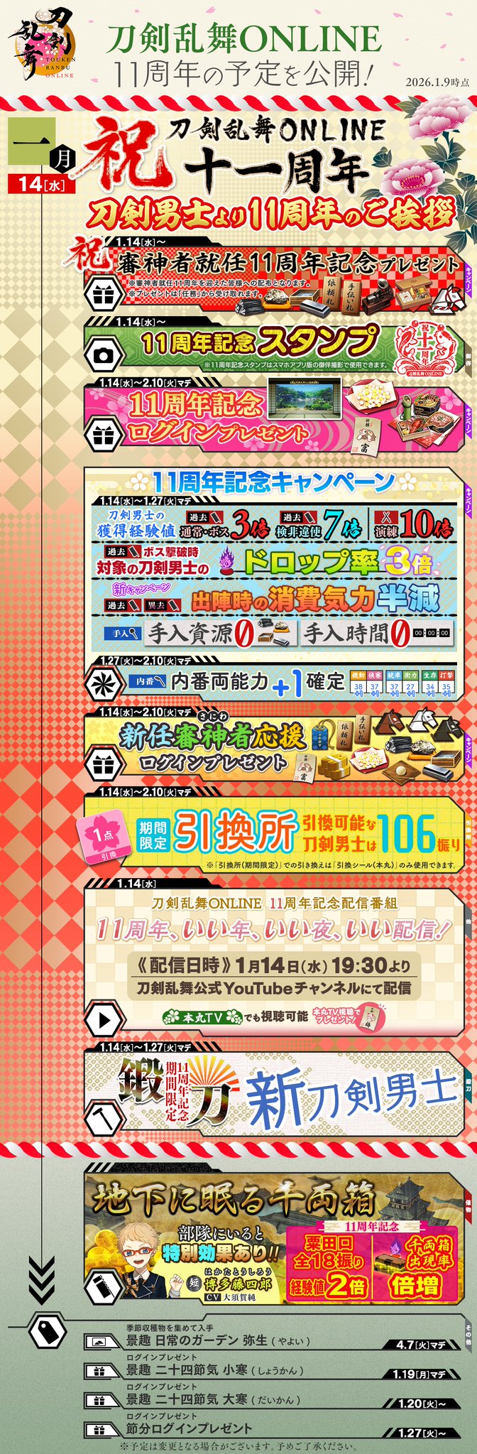 1月の今後の予定を公開いたします!次回十一周年の詳細情報を追加した今後の予定は1月9日(金)に公開予定です。引き続き『刀剣乱舞ONLINE』をよろしくお願いいたします。#刀剣乱舞 #とうらぶ pic.twitter.com/0BVXBREVhW