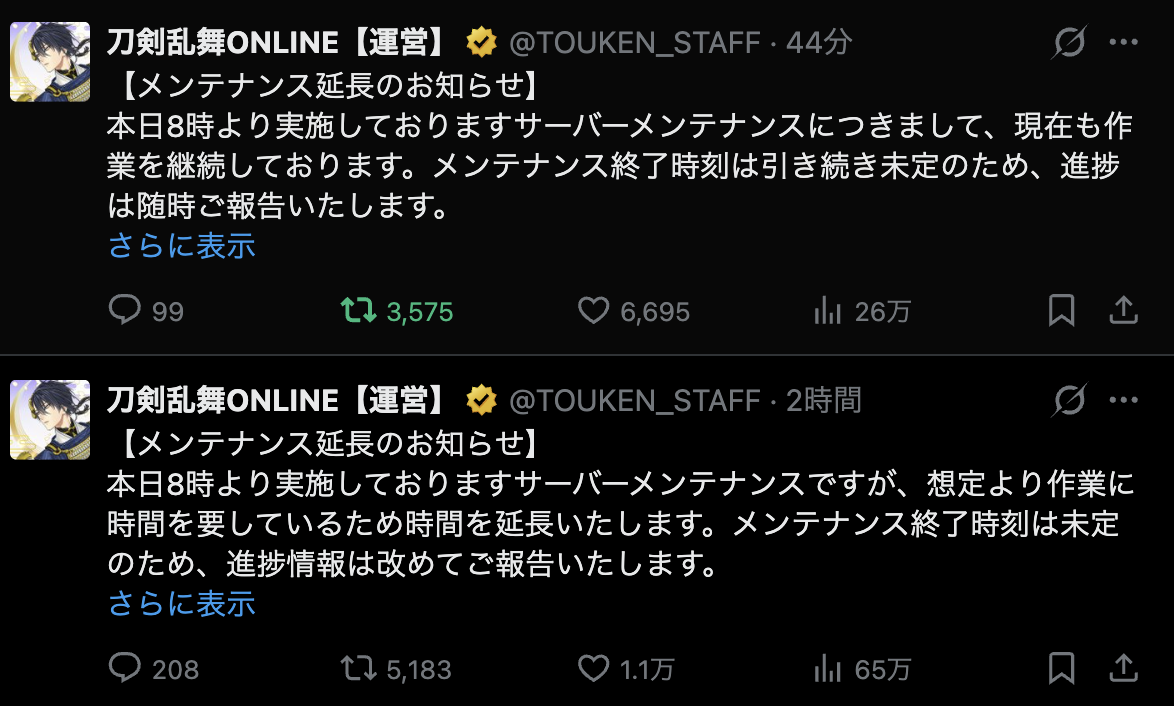 △△「メンテ延長してごめんて笑」