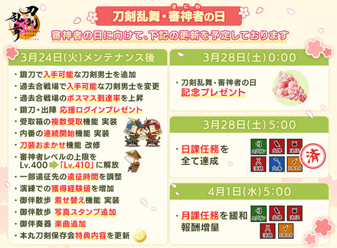 - 【2026/3/24メンテ】鍛刀と合戦場ドロップが変更、ボス到達率上昇、審神者レベル410に、各種機能拡充、...