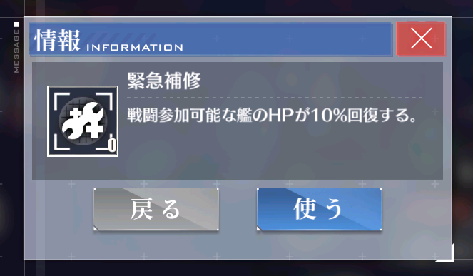 ゲーム内に登場する「工作艦」の「緊急補修回数+X」効果は、海域マップ画面右下の「緊急補修」の使用回数のことを指します。