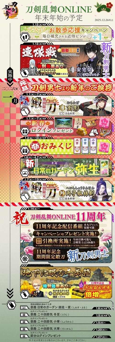 - 2026年1月と正月と11周年の予定公開、新刀剣鍛刀イベ!正月に機動プラス15の馬が販売