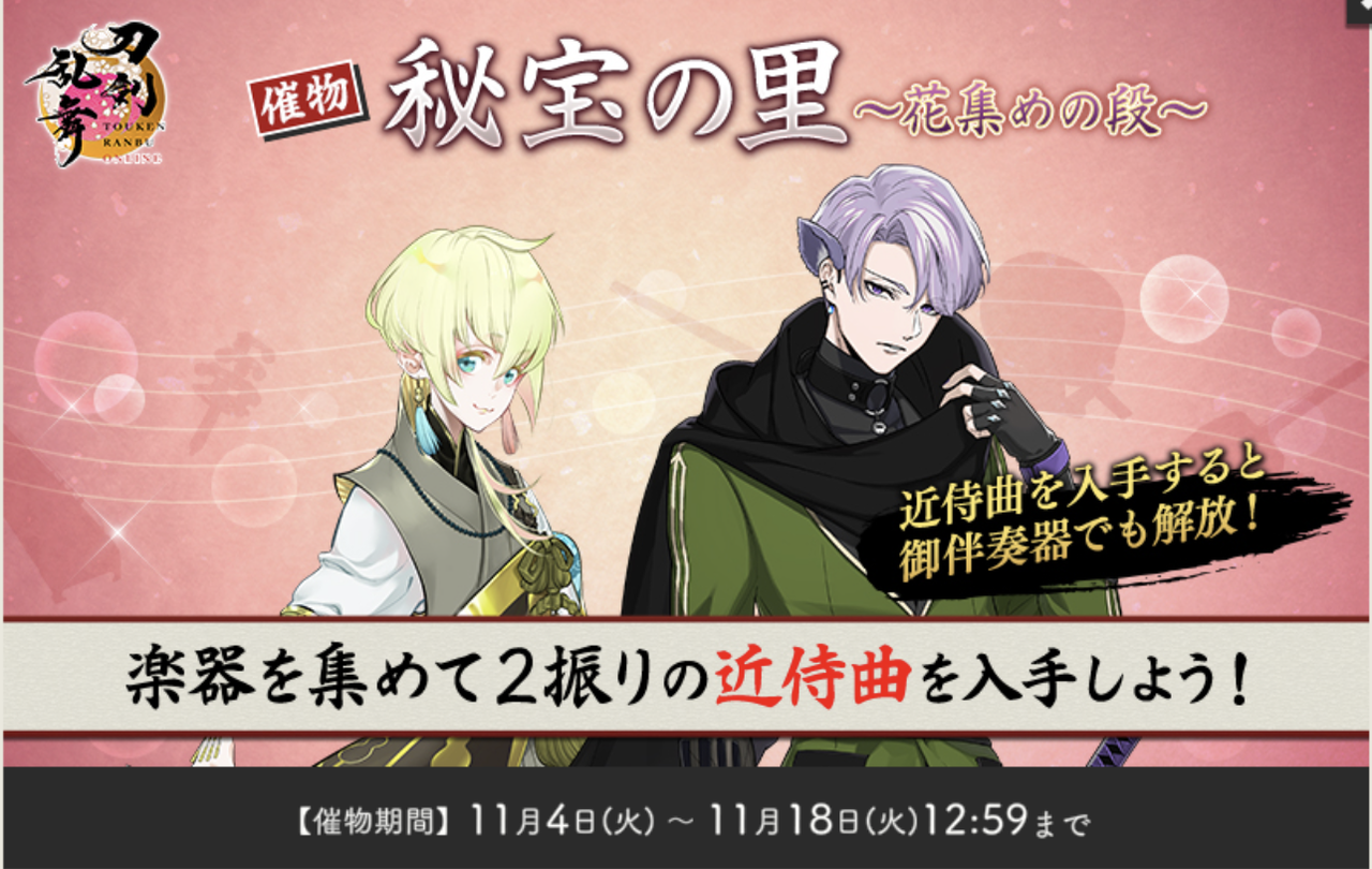 「楽器兵」は催物「秘宝の里 ~花集めの段~」のみで効果が発動する限定の刀装です。催物期間中、刀種にかかわらず全ての刀剣男士に装備できます。※効果発動の対象となるのは「楽器兵」を装備した刀剣男士のみとなります。